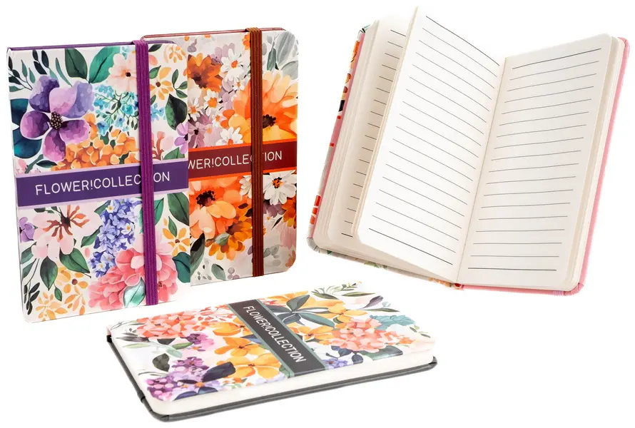 Jedná se o linkovaný zápisník s gumičkou, který má na obálce atraktivní květinový motiv. Zápisník o rozměrech 8,5 x 14 cm obsahuje 80 listů. Je k dispozici v mixu vzorů v barvách: hnědá, růžová, šedá a fialová. Pokud je pro zákazníka důležitý konkrétní motiv, je potřeba ho specifikovat v poznámkách k objednávce.