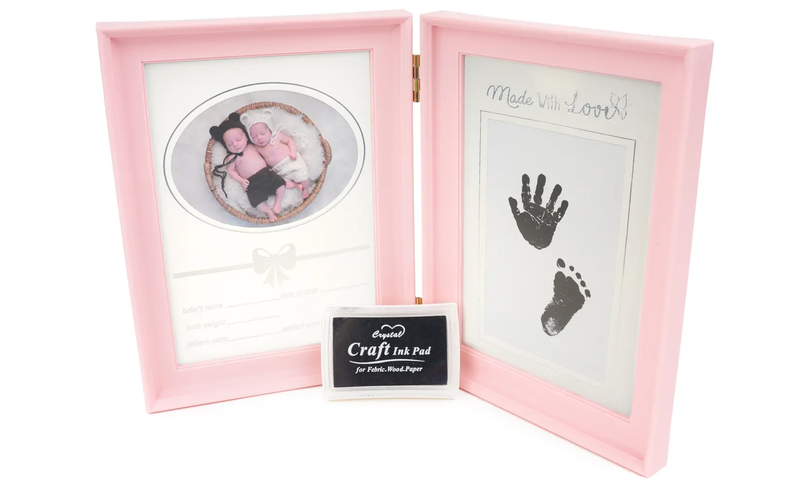 plastic double frame, frame size 31,5 x 20,6 cm, bar width 2 cm, for standing, includes ink pad for making an imprint of the child's hand or foot, photo is covered with glass