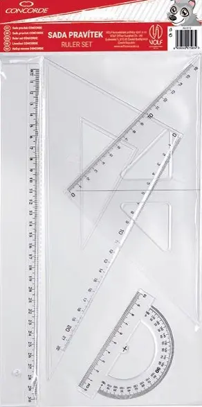 set of 4 pieces • ruler with 30 cm scale • triangle with a ruler and 16 cm/45° scale • triangle with 22 cm/60° scale • protractor with 10 cm/180° scale