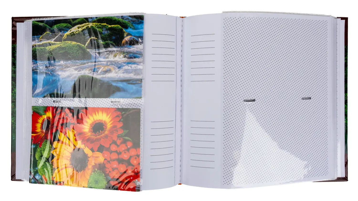Uchovejte si své vzpomínky z dovolené v tomto elegantním fotoalbu, které má na obalu motiv přírody. Pevné desky z laminovaného papíru a šitá vazba zaručují odolnost a dlouhou životnost. Album pojme až 200 fotografií ve formátu 10 x 15 cm, které se vkládají dvě nad sebe. Mezi fotografiemi je navíc prostor pro vlastní popisky, díky kterým si snadno uchováte všechny důležité okamžiky.
