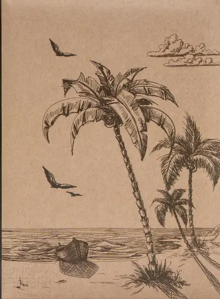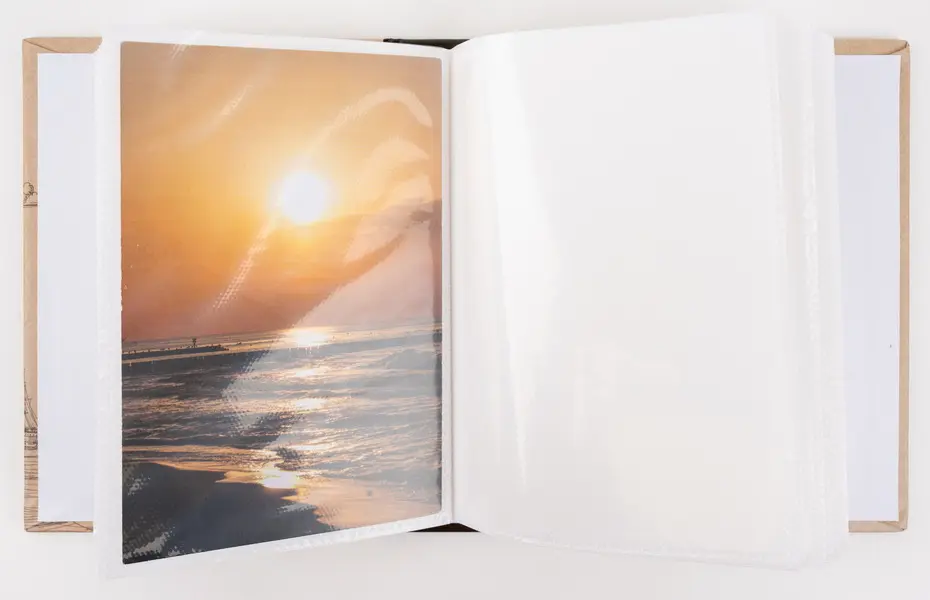 Jedná se o malé a kompaktní zasunovací fotoalbum s laminovanou obálkou v přírodních, hnědých tónech. Album má svařovanou vazbu ve formě knihy. Je ideální pro uchování 100 fotografií formátu 10 x 15 cm, které se vkládají zasouváním, a neumožňuje popisky. Listy jsou vyrobeny z bílého PVC/PP materiálu. Na obálce je vyobrazen retro motiv námořní tematiky tvořený perokresbou v sépiových tónech na hnědém (kraftovém) podkladu. Kresba znázorňuje palmy na pláži, loďku na břehu a siluety ptáků na pozadí moře a oblohy. Díky tomuto neutrálnímu a stylovému motivu je album ideální pro uchování vzpomínek z cest, dovolené u moře, nebo jiných cenných zážitků.