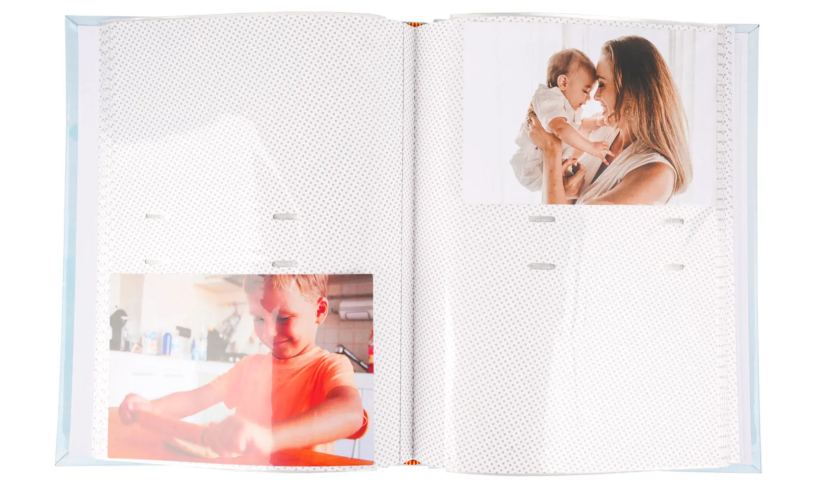Uchovejte si vzpomínky na dětství ve fotoalbu s roztomilým dětským motivem v modré barvě. Díky šité vazbě a pevnému laminovanému papíru je album velmi odolné. Pojme až 100 fotografií ve formátu 10 x 15 cm, které se vkládají dvě nad sebe. U každé fotografie je navíc místo pro vložení popisku.