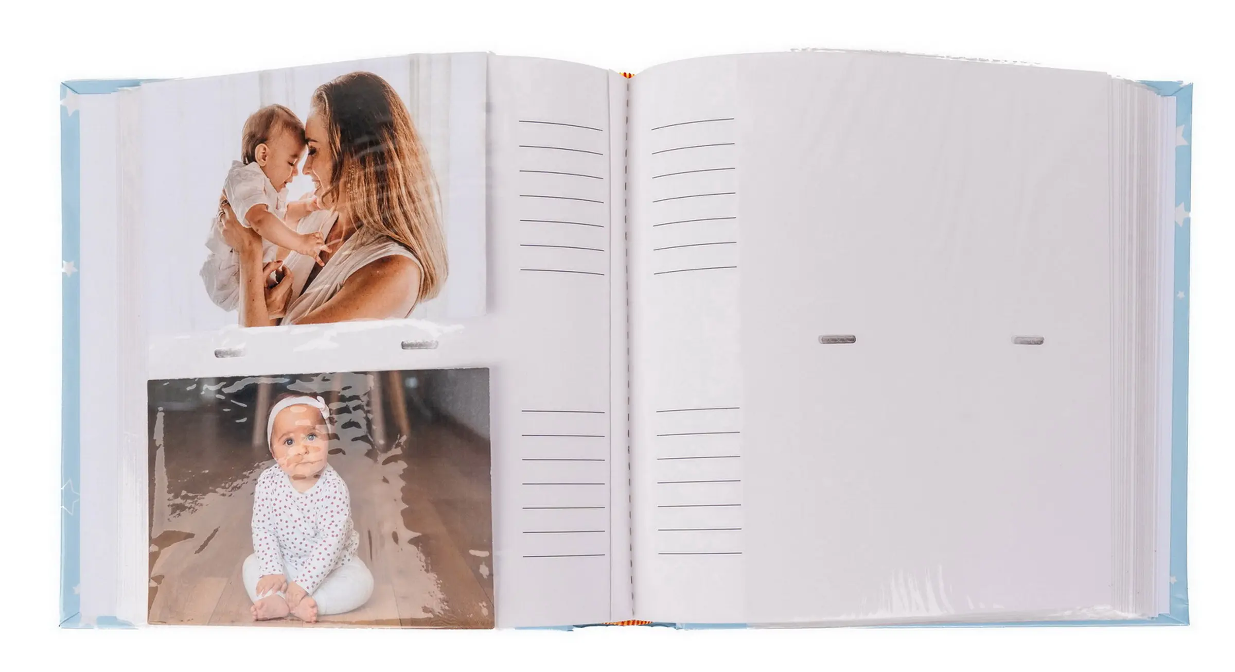 Toto zasunovací fotoalbum v provedení světle modré barvy s dětským motivem pojme 200 fotografií o formátu 10 x 15 cm. Album ve vazbě šitá kniha má laminovanou papírovou obálku a umožňuje ukládat 2 fotografie na stránku. Bílé papírové listy obsahují prostor pro vložení popisek k fotografiím. Rozměr alba činí 22 x 22 cm.