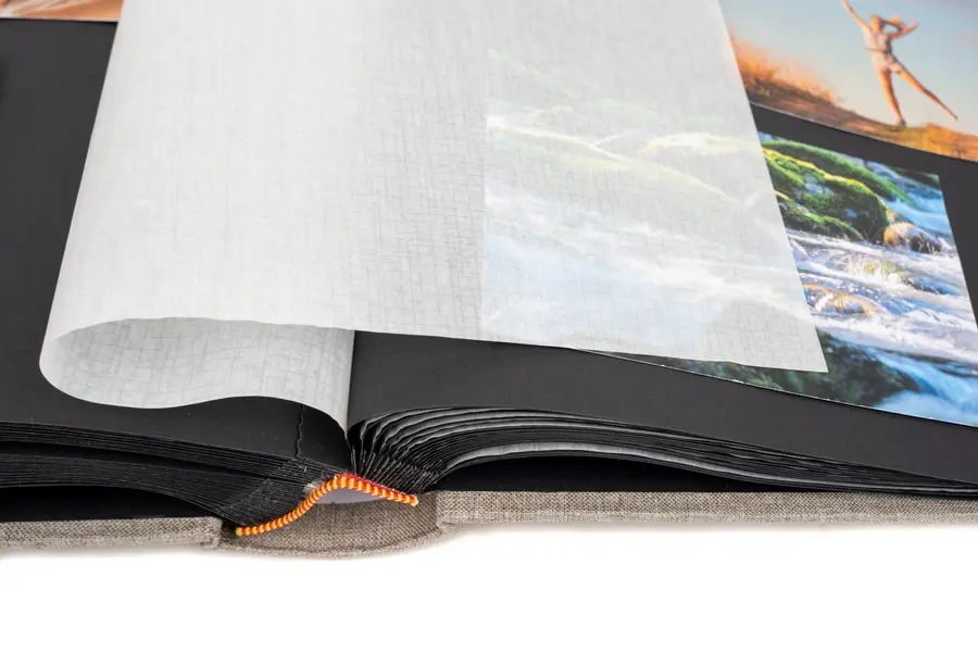 klasické fotoalbum, 100 stran, rozměr alba 31 x 33 cm, rozměr listu 29 x 32 cm, dělící pergamenové listy, černé listy, šitá kniha