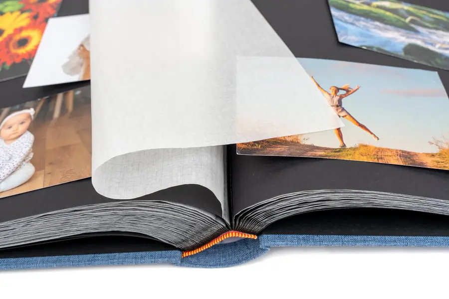 klasické fotoalbum, 100 stran, rozměr alba 31 x 33 cm, rozměr listu 29 x 32 cm, dělící pergamenové listy, černé listy, šitá kniha