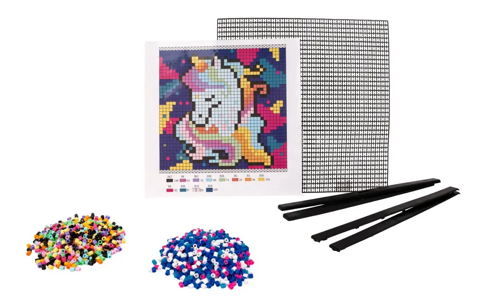 Jedná se o kreativní sadu pro děti, se kterou si vytvoří krásný 3D obrázek metodou nacvakávání korálků. Sada obsahuje vše potřebné pro mozaikovou tvorbu: předlohu (podložku s mřížkou) a obrázek s barevným schématem, který slouží jako vodítko pro umístění korálků. Motiv zobrazuje pohádkového jednorožce s duhovou hřívou na tmavě modrém pozadí. Balení dále obsahuje korálky na nacvaknutí v odpovídajících barvách a dva černé rámečky pro finální zarámování obrázku. Předloha má rozměr 28 x 29 cm. Tato zábavná aktivita rozvíjí u dětí soustředění a jemnou motoriku.