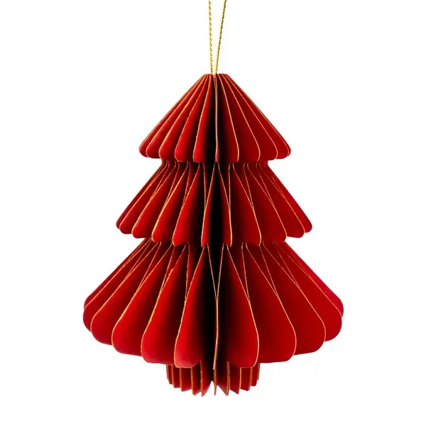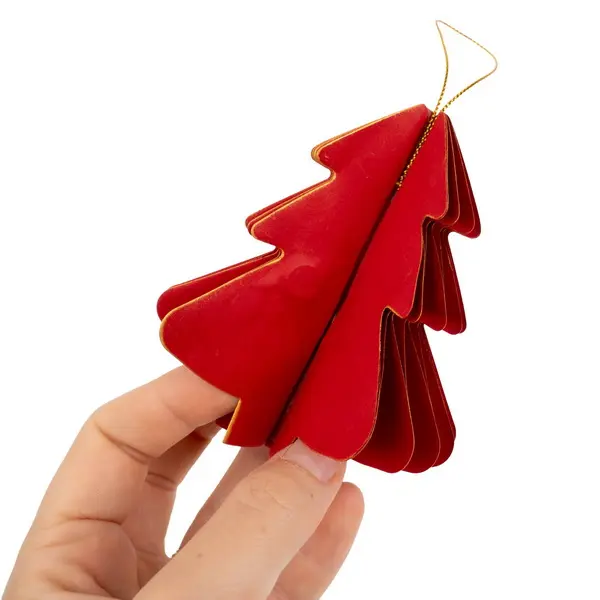 Jedná se o papírovou dekorační ozdobu ve tvaru vánočního stromečku. Ozdoba má skládanou (harmonikovou) konstrukci, která po rozložení vytvoří trojrozměrný tvar. Po složení drží ozdoba pohromadě pomocí magnetu. Je vyvedena v elegantní tmavě červené barvě se zlatými okraji a je ideální pro zavěšení. Velikost ozdoby je cca 10 cm.