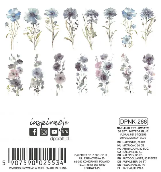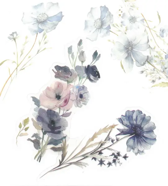 Jedná se o 30 kusů fóliových samolepek s motivem třpytivých květin v modro-šedých odstínech. Velikost jednotlivých samolepek je přibližně 7 cm. Jsou ideální pro dekoraci přáníček, dárků, deníků, fotoalb a pro různé kreativní projekty.