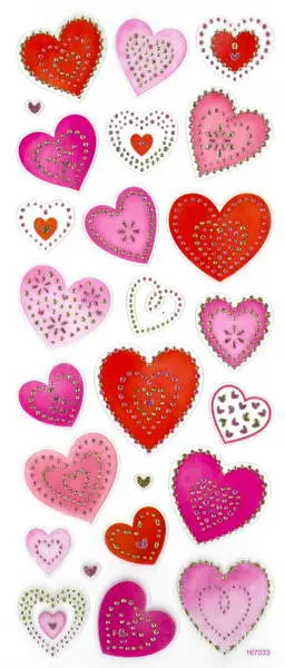 Papírové samolepky s třpytkami (glitterové) s motivem srdíček jsou obsaženy v sadě 25 kusů. Najdeme zde srdce v červených a růžových odstínech, zdobené třpytkami. Velikost jednotlivých samolepek se pohybuje od 0,5 cm do 4 cm a jsou umístěny na archu o rozměru 10 x 23 cm. Jsou ideální pro dekoraci přáníček, dárků, deníků, fotoalb, scrapbookingových projektů a dalších kreativních výtvorů.