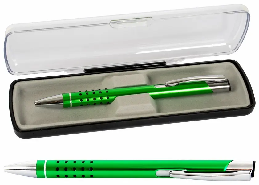 metalowy długopis automatyczny, wymienny wkład F-Parker, uchwyt z gumowymi wypustkami dla wygodnego trzymania, niebieski kolor tuszu, grubość linii 0,7 mm, pudełko upominkowe