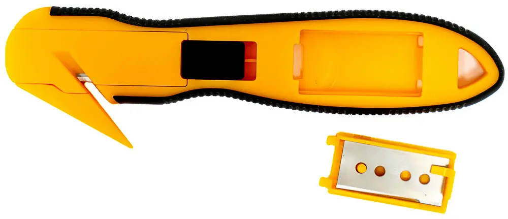 bezpieczny nóż z antypoślizgowym uchwytem i krytym ostrzem, bezpiecznie tnie karton, folię stretch i taśmę, zawiera zapasowe ostrze