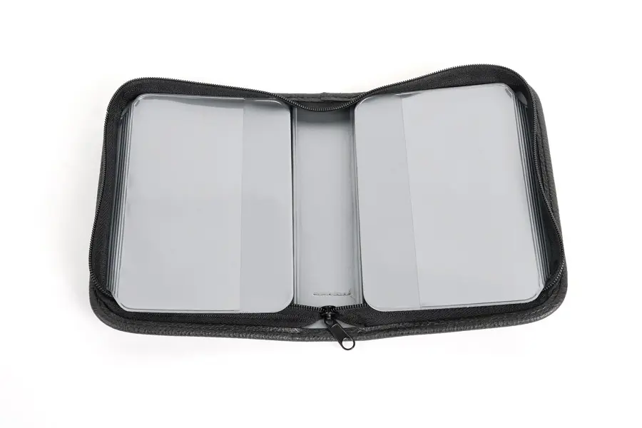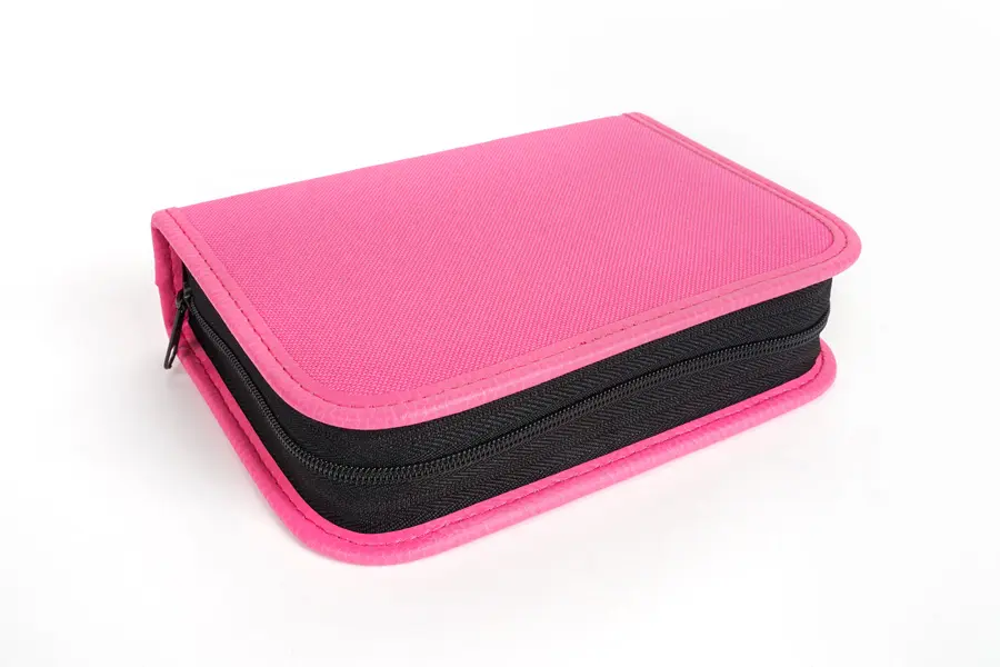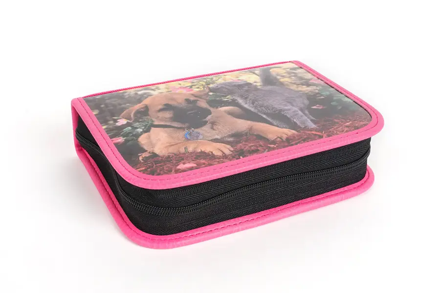 tekstylny jednopoziomowy piórnik z dwiema klapkami, zmywalny, wymiary 20 x 5 x 14 cm (szer. x wys. x gł.), bez wyposażenia