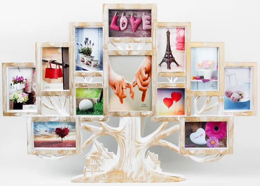 plastikowa ramka na 9 foto 10 x 15 cm, 2 foto 10 x 10 cm a 1 foto 15 x 20 cm, rozmiar ramki 82 x 58 cm, do zawieszenia, zdjęcie zakryte plexi