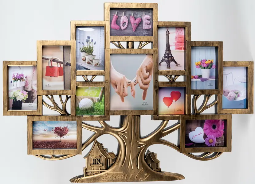plastikowa ramka na 9 foto 10 x 15 cm, 2 foto 10 x 10 cm a 1 foto 15 x 20 cm, rozmiar ramki 82 x 58 cm, do zawieszenia, zdjęcie zakryte plexi