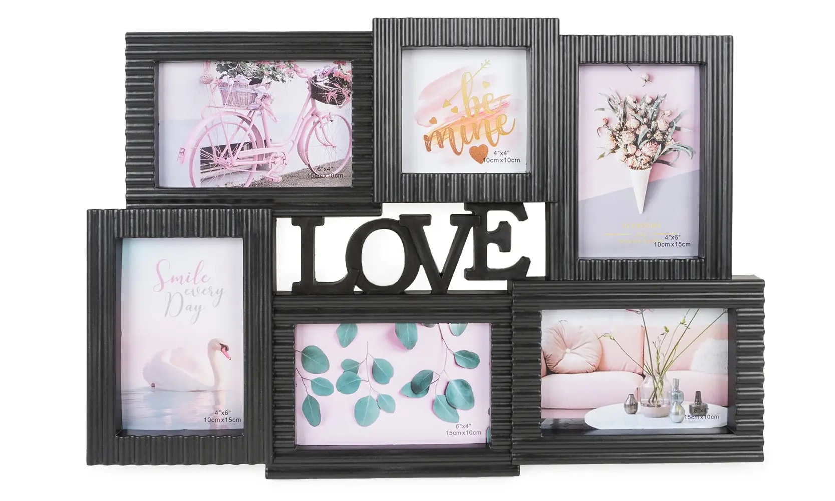 plastikowa ramka na 5 foto 10 x 15 cm i 1 foto 10 x 10 cm, rozmiar ramki 49 x 34 cm, do zawieszenia, zdjęcie zakryte plexi
