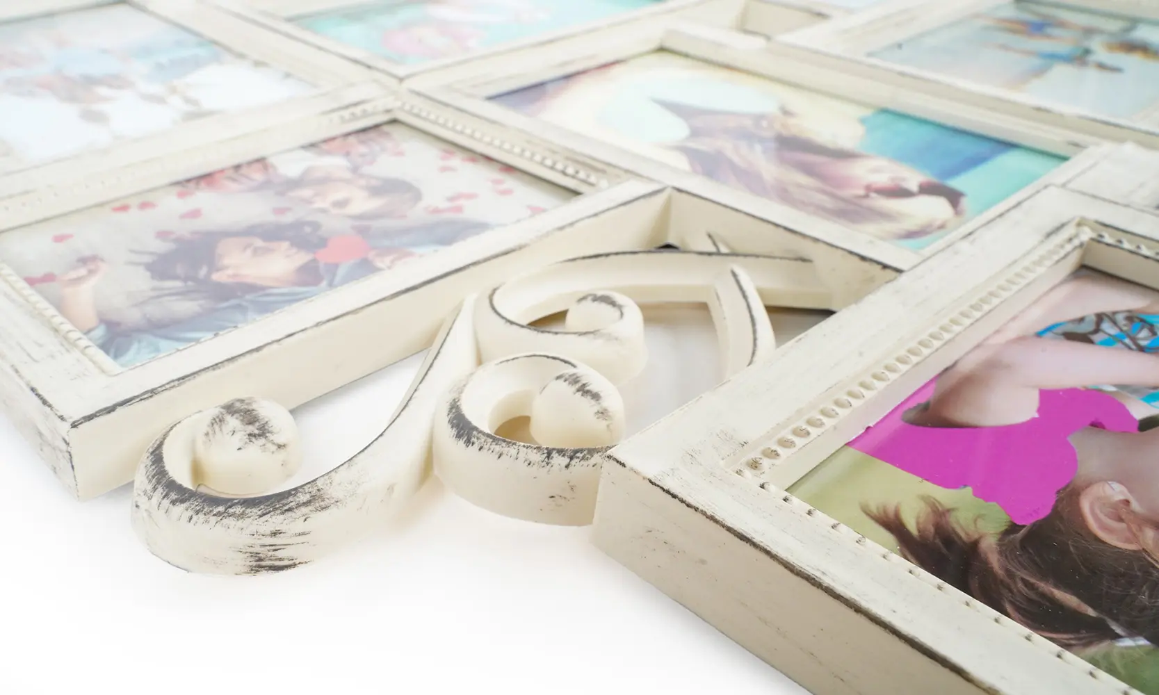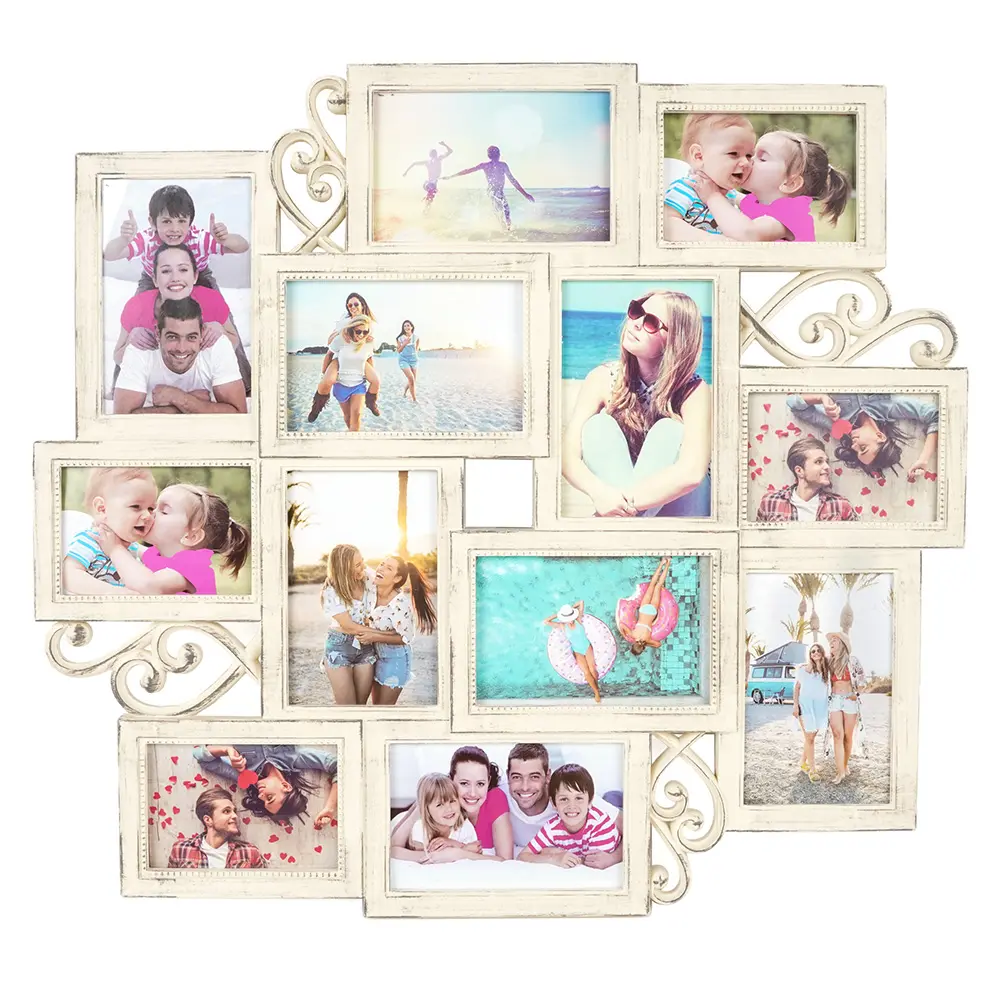 plastikowa ramka na 8 foto 10 x 15 cm a 4 foto 9 x 13 cm, rozmiar ramki 55 x 50,5 cm, do zawieszenia, zdjęcie zakryte plexi