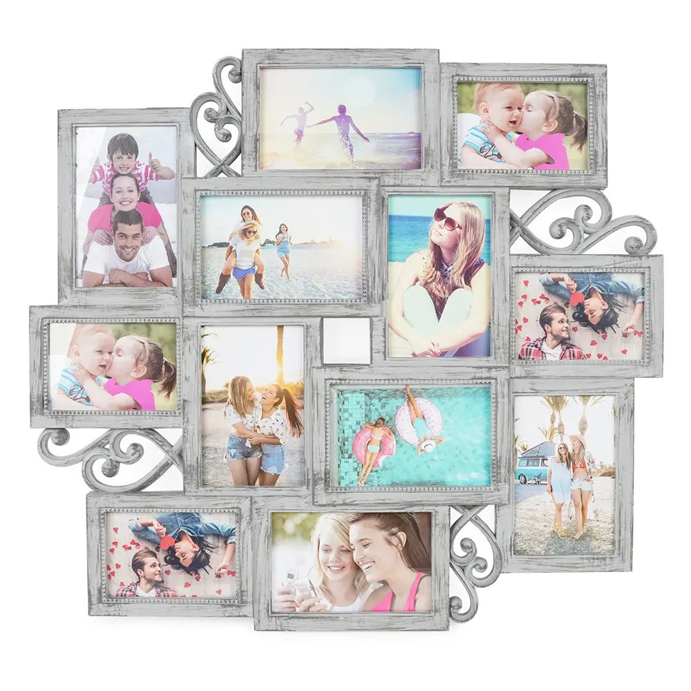 plastikowa ramka na 8 foto 10 x 15 cm a 4 foto 9 x 13 cm, rozmiar ramki 55 x 50,5 cm, do zawieszenia, zdjęcie zakryte plexi