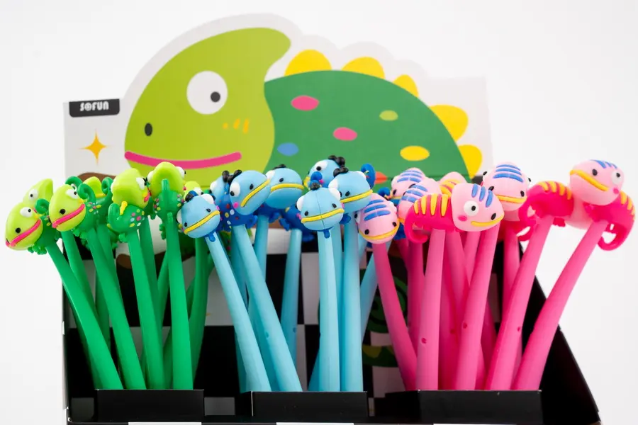 silikonové gelové pero s víčkem, vyměnitelná náplň F-Expert/Techjob Office, tělo z pružného materíálu, modrý inkoust, šíře stopy 0,5 mm, v balení mix vzorů a barev