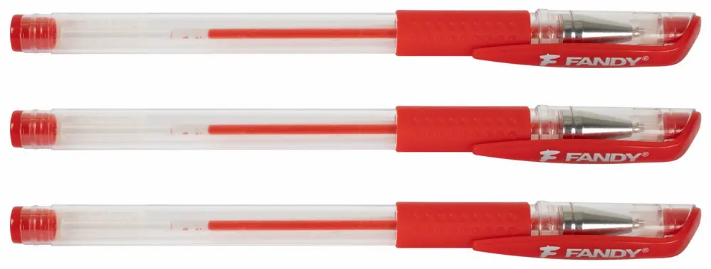 plastové gelové pero, gumová úchopová část pro pohodlné držení, vyměnitelná náplň, červený inkoust, šíře stopy 0,5 mm