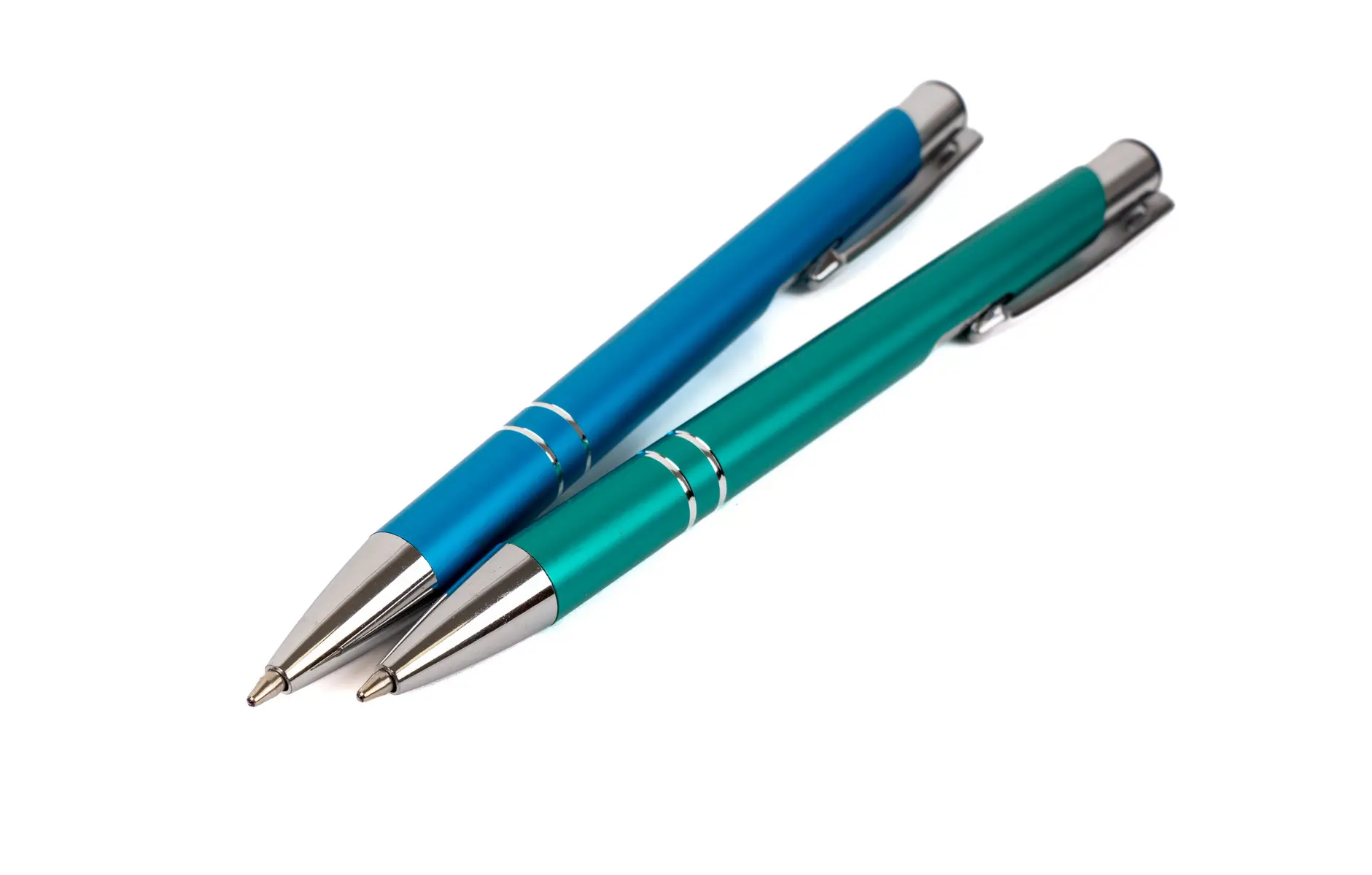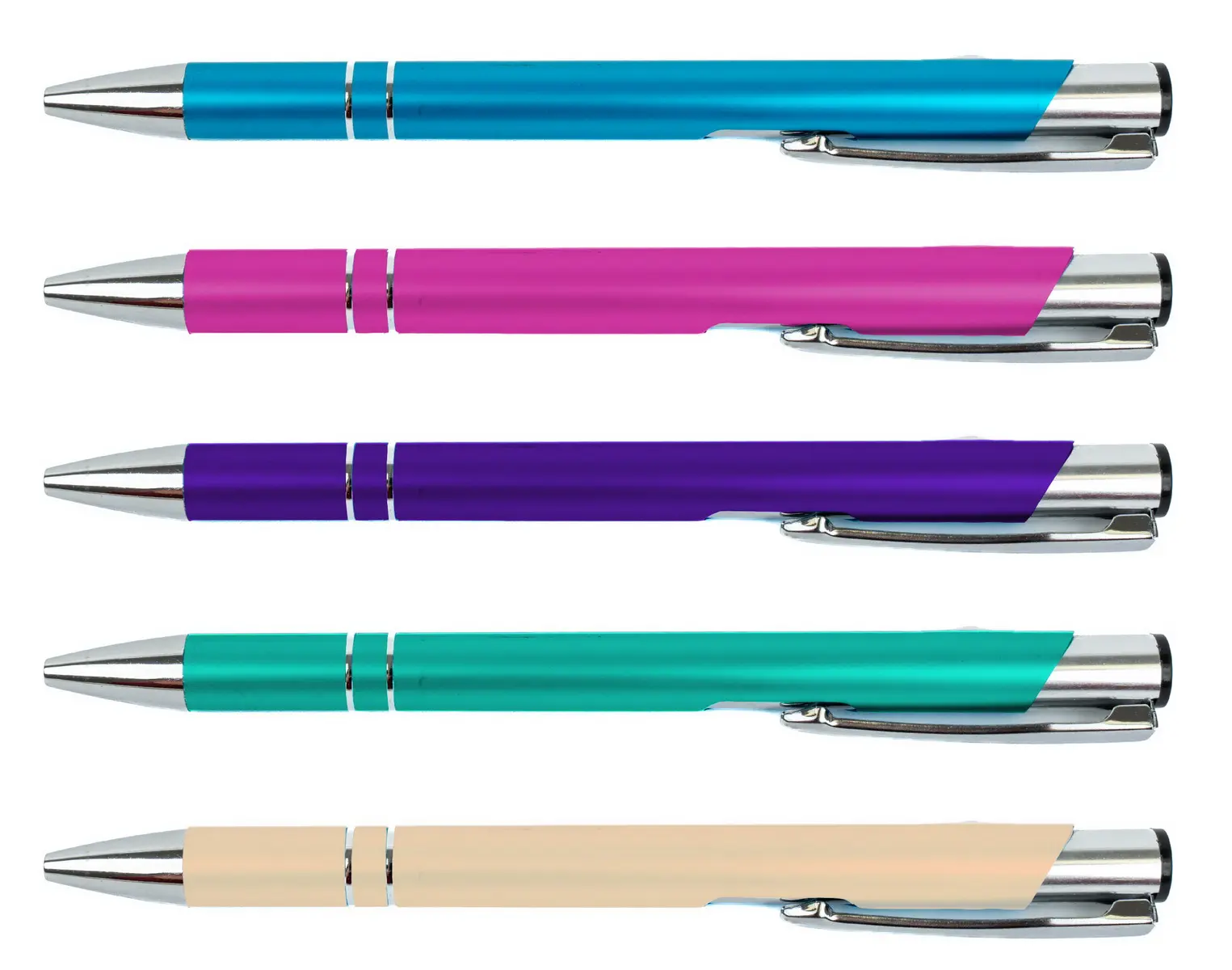 kovové kuličkové pero, stiskací mechanismus, stříbrné doplňky, vyměnitelná náplň F-Parker, modrý inkoust, šíře stopy 0,7 mm, mix barev