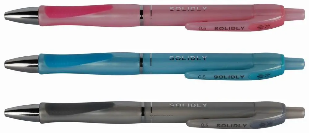 plastové kuličkové pero, stiskací mechanismus, gumová úchopová část pro pohodlné držení, vyměnitelná náplň F-411, modrý inkoust, šíře stopy 0,5 mm, mix barev