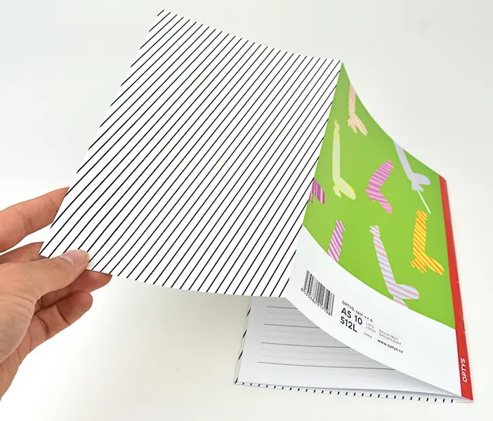 bezdřevý • 2x lenoch je součástí obalu v přední i zadní části sešitu - snadno se jím podloží každá stránka • moderní design • barevný motiv obalu