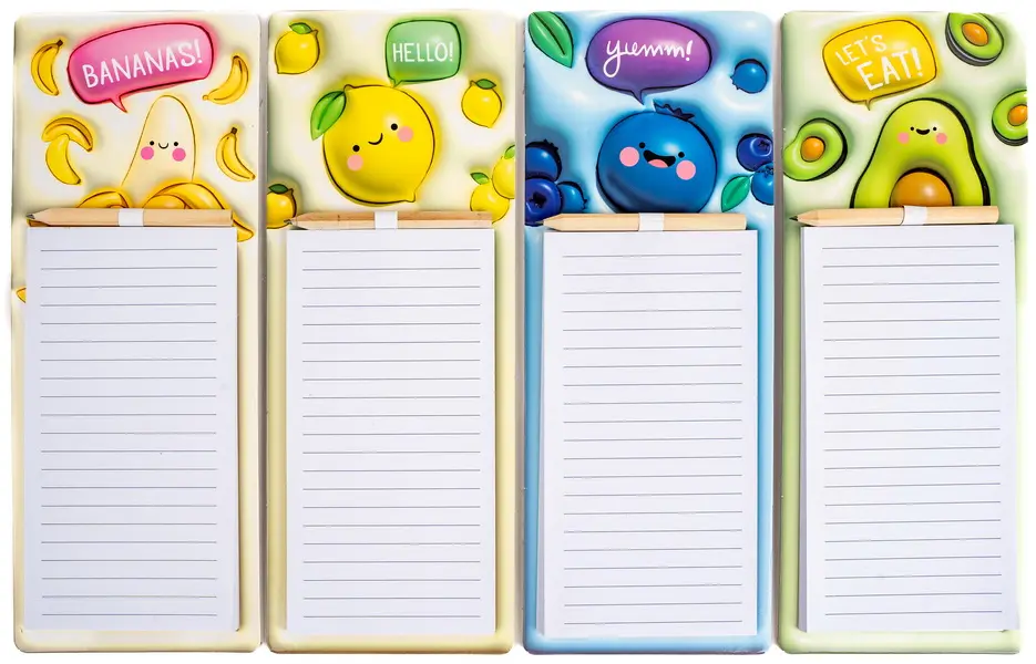 Tento praktický magnetický blok s veselým motívom ovocia je skvelý na poznámky, odkazy alebo nákupné zoznamy. Na zadnej strane je magnet, vďaka ktorému môžete blok jednoducho pripevniť na chladničku, magnetickú tabuľu alebo akýkoľvek kovový povrch, a mať ho tak vždy poruke. Blok obsahuje 40 listov s rozmermi 9 x 17 cm. Veľkosť celého bloku je 10,5 x 27 cm. Súčasťou bloku je aj ceruzka. Vyberať môžete z niekoľkých dizajnov. Cena je uvedená za 1 kus albumu. Pokiaľ Vám záleží na konkrétnom motíve (napr. farba), špecifikujte ho, prosím, čo najpresnejšie v poznámke k objednávke.