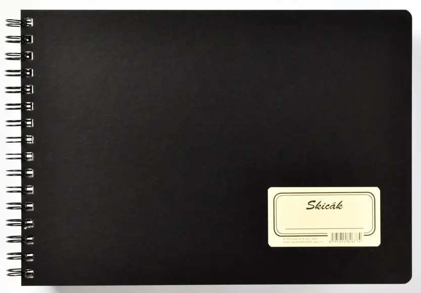 pevné desky černé barvy • 50 listů • gramáž papíru 190 g/m² • štítek na přední obálce pro nadepsání skicáku • boční kroužková vazba TWIN WIRE