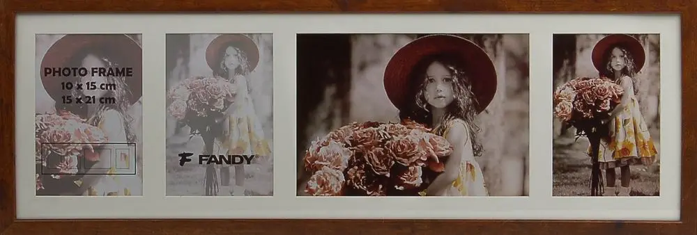 drevený rámček na 3 foto 10 x 15 cm a 1 foto 15 x 21 cm, rozmer rámčeka 61,5 x 21 cm, na zavesenie vertikálne i horizontálne, šírka lišty 1,5 cm, fotografia je krytá sklom