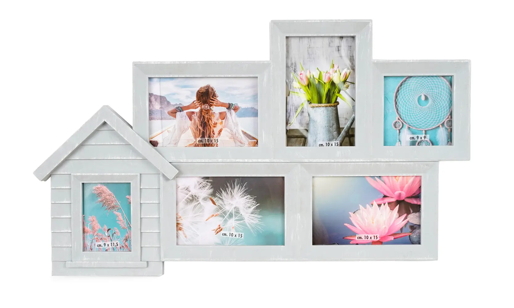 plastový rámček na 4 foto 10 x 15 cm, 1 foto 9 x 11,5 cm a 1 foto 9 x 9 cm, veľkosť rámčeka 55 x 32 cm, na zavesenie, fotografia je krytá plexisklom