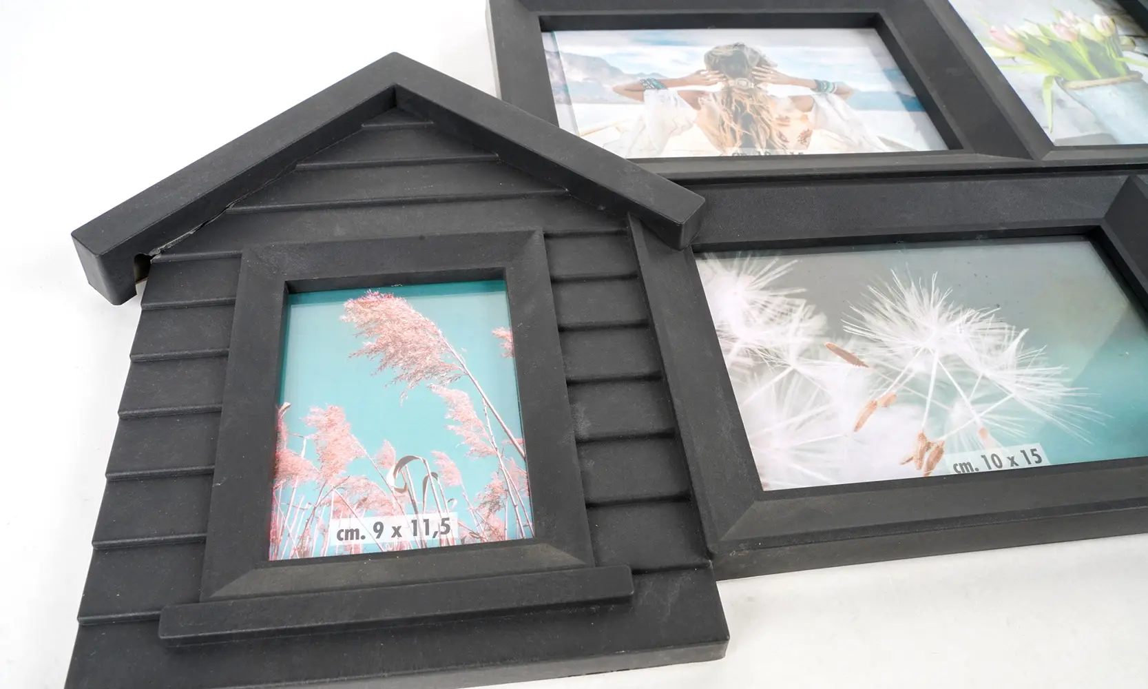 plastový rámček na 4 foto 10 x 15 cm, 1 foto 9 x 11,5 cm a 1 foto 9 x 9 cm, veľkosť rámčeka 55 x 32 cm, na zavesenie, fotografia je krytá plexisklom