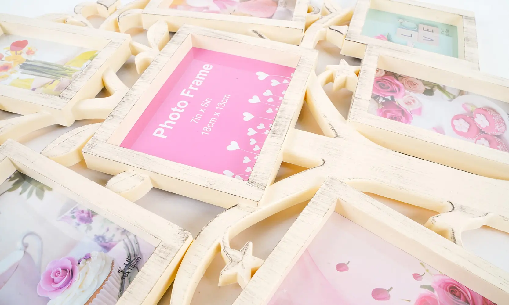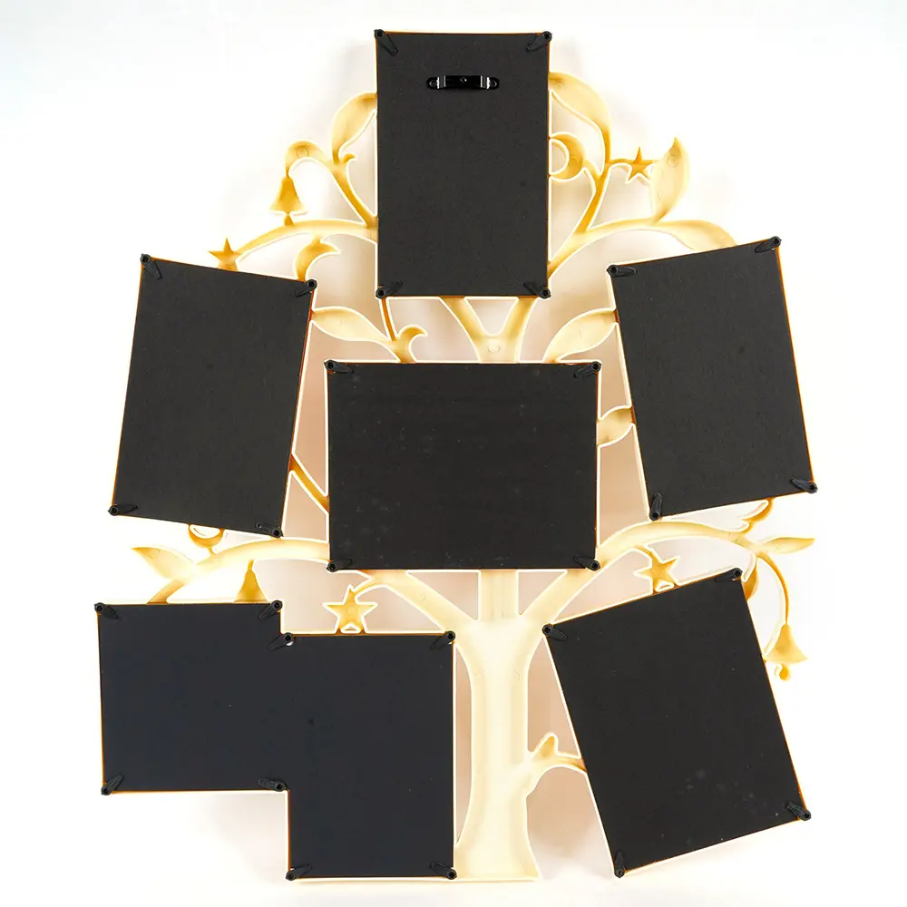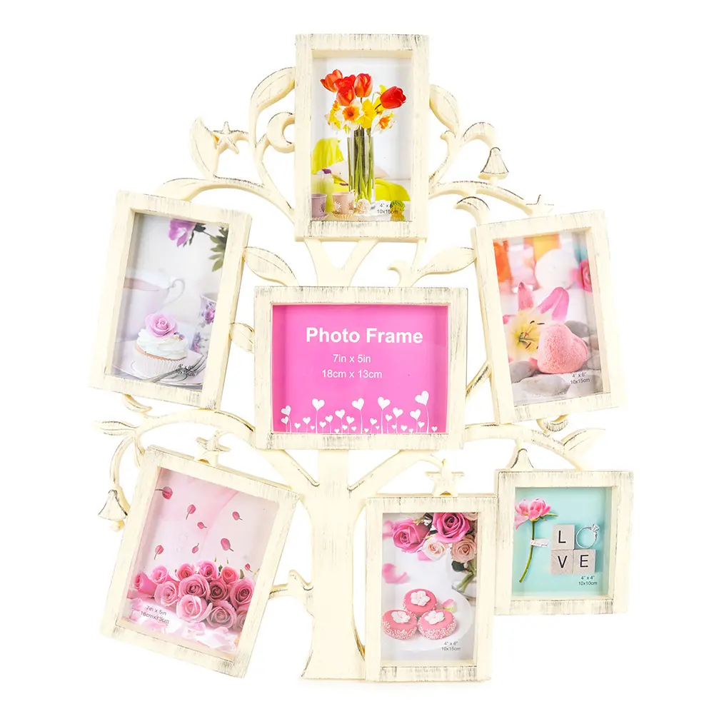 plastový rámček na 4 foto 10 x 15 cm, 2 foto 13 x 18 cm a 1 foto 10 x 10 cm, veľkosť rámčeka 53,5 x 45 cm, na zavesenie, fotografia je krytá plexisklom