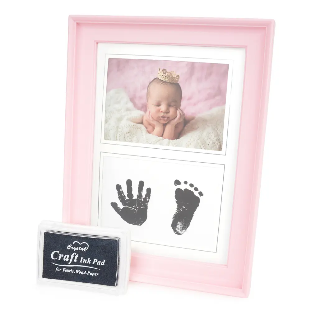 plastový rámček, rozmery rámčeka 15,5 x 20,6 cm, šírka lišty 2 cm, na postavenie alebo zavesenie, obsahuje atramentovú podložku na odtlačok detskej ruky alebo nohy, fotografia je krytá sklom
