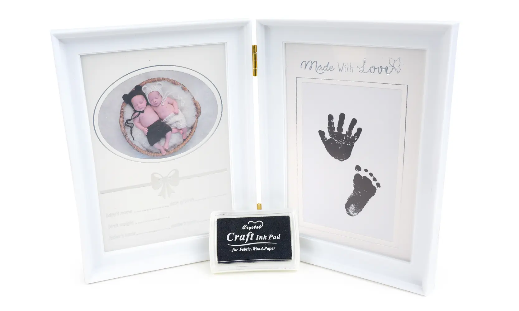 plastový dvojitý rámček, rozmery 31,5 x 20,6 cm, šírka lišty 2 cm, na postavenie, obsahuje atramentovú podložku na odtlačok detskej ruky alebo nohy, fotografia je krytá sklom