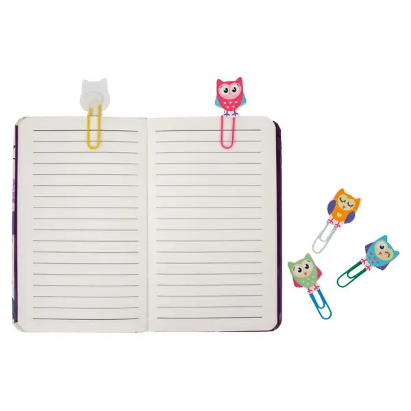 Ide o sadu 10 ks veselých listových spon s dekoračnou drevenou aplikáciou. Drevená aplikácia má tvar roztomilých sov v rôznych živých farbách, ako je ružová, fialová, tyrkysová, oranžová a zelená. Samotné spony sú kovové a farebne zladené so sovami (ružová, žltá, zelená, biela, modrá). Spona má dĺžku 4,5 cm. Sú ideálne pre organizáciu dokumentov, školských prác alebo ako originálne záložky do kníh.