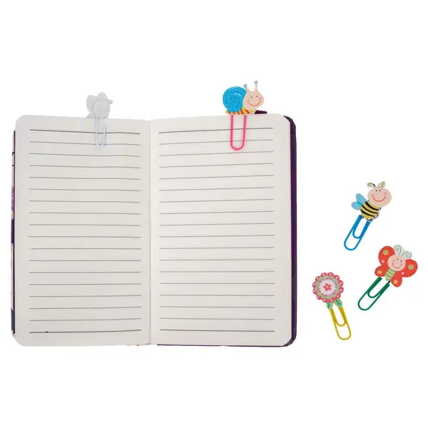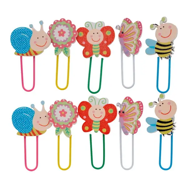 Ide o sadu 10 ks veselých listových spon s dekoračnou drevenou aplikáciou. Drevená aplikácia má tvar rôznych jarných a letných motívov, ako sú slimáky, kvety, motýle a včielky, vyvedených v živých pastelových a sýtych farbách (ružová, zelená, modrá, žltá). Samotné spony sú kovové a farebne zladené s motívmi. Spona má dĺžku 4,5 cm. Sú ideálne pre organizáciu dokumentov, školských prác alebo ako originálne záložky do kníh.