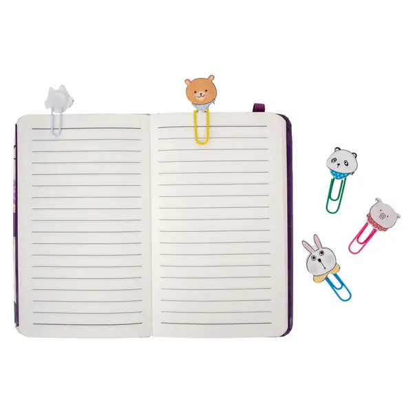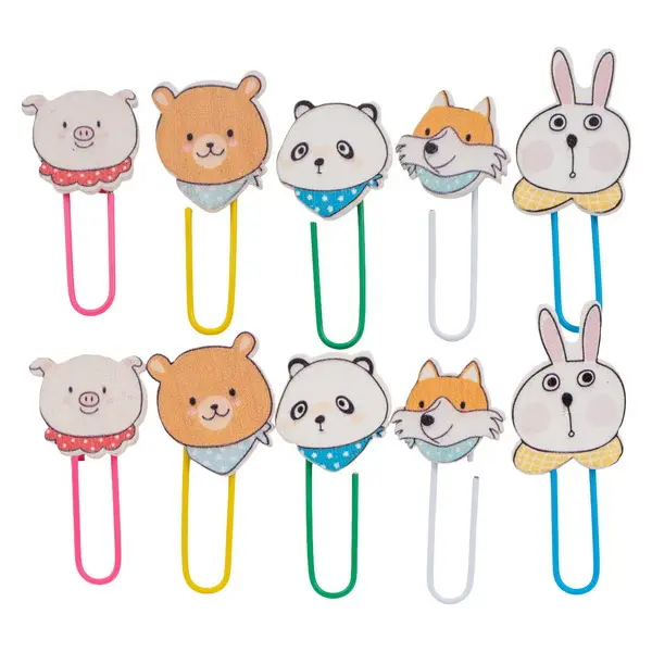 Ide o sadu 10 ks veselých listových spon s dekoračnou drevenou aplikáciou. Drevená aplikácia má tvar roztomilých zvieratiek, ako sú prasiatka, medvedíky, pandy, líšky a zajačikovia, často doplnených šatkami a vyvedených v pastelových farbách. Samotné spony sú kovové a farebne zladené so zvieratkami (ružová, žltá, zelená, biela, modrá). Spona má dĺžku 4,5 cm. Sú ideálne pre organizáciu dokumentov, školských prác alebo ako originálne záložky do kníh.