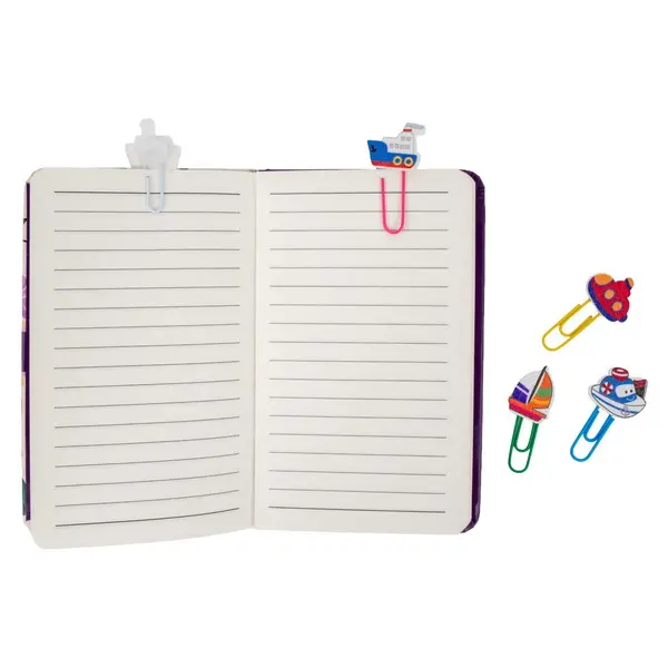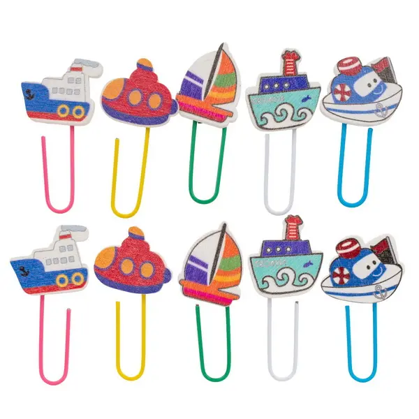 Ide o sadu 10 ks veselých listových spon s dekoračnou drevenou aplikáciou. Drevená aplikácia má tvar rôznych lodí a vozidiel, ako sú parníky, ponorky, plachetnice, motorové lode. Motív je vyvedený v jasných farbách s akcentmi červenej, modrej, žltej a zelenej. Samotné spony sú kovové a farebne zladené s motívmi (ružová, žltá, zelená, biela, modrá). Spona má dĺžku 4,5 cm. Sú ideálne pre organizáciu dokumentov, školských prác alebo ako originálne záložky do kníh.