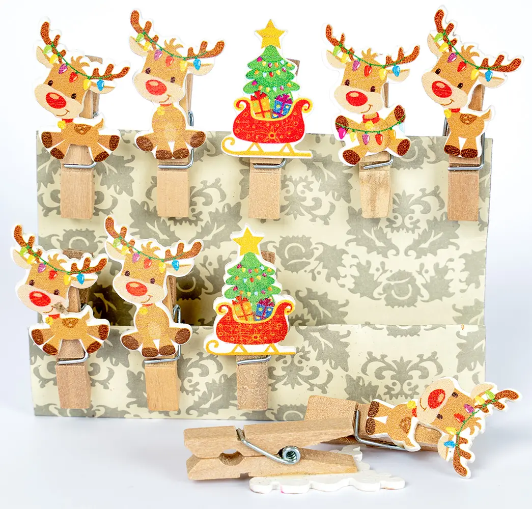 Ide o sadu 10 dekoračných štipcov s veselým vianočným motívom sobov a vianočných stromčekov. Štipce sú vyrobené z prírodného dreva a sú osadené aplikáciami s trblietavým glitrovým lakom (na sobovi a na darčekoch pod stromčekom). V balení nájdete mix roztomilých sobov ovenčených svetielkami a stromčekov na saniach. Štipce majú dĺžku 3,5 cm a sú ideálne na dekoráciu, zavesenie drobných odkazov, fotiek, alebo na tvorbu vianočnej girlandy.