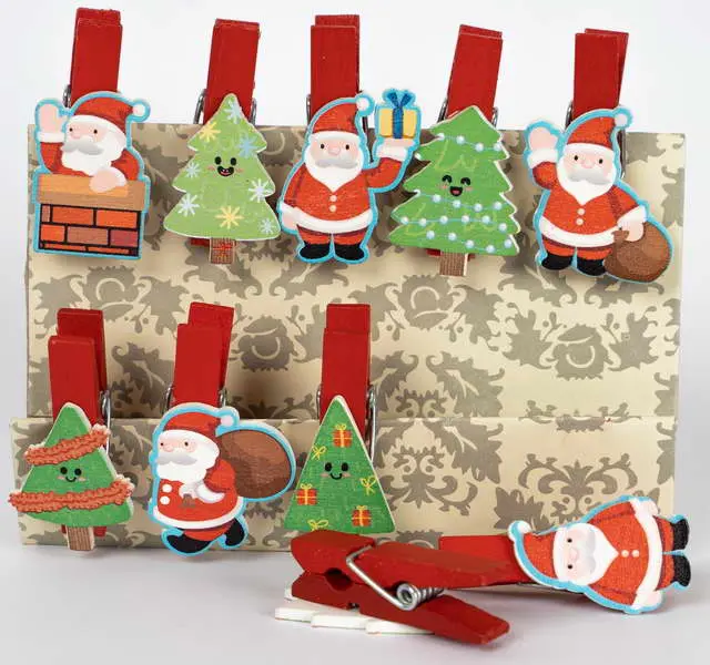 Ide o sadu 10 dekoračných štipcov s veselým vianočným motívom Santa Clausa a vianočných stromčekov. Štipce sú vyrobené z červeného dreva a sú osadené aplikáciami s glitrovým lakom a výraznými obrysmi. V balení nájdete Santu na komíne, Santu s darčekom, Santu s vrecom a veselé vianočné stromčeky. Štipce majú dĺžku 3,5 cm a sú ideálne na dekoráciu, zavesenie drobných odkazov, fotiek, alebo na tvorbu vianočnej girlandy.