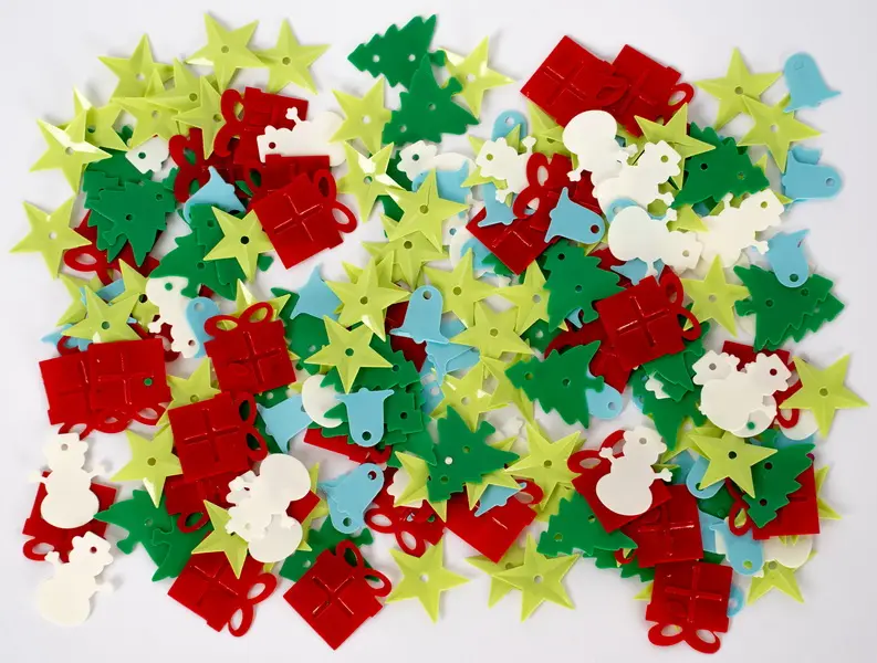 Ide o dekoračné flitre vo vianočnom mixe tvarov a farieb. V balení nájdete tvary ako hviezdy, stromčeky, darčeky, rolničky a snehuliaci v tradičných vianočných farbách (červená, zelená, biela, žltá/zlatá a modrá). Flitre majú veľkosť približne 10-15 mm a sú ideálne na zdobenie prianí, darčekov, kostýmov, vianočných dekorácií alebo pre rôzne kreatívne projekty. Balenie obsahuje 20 g flitrov.