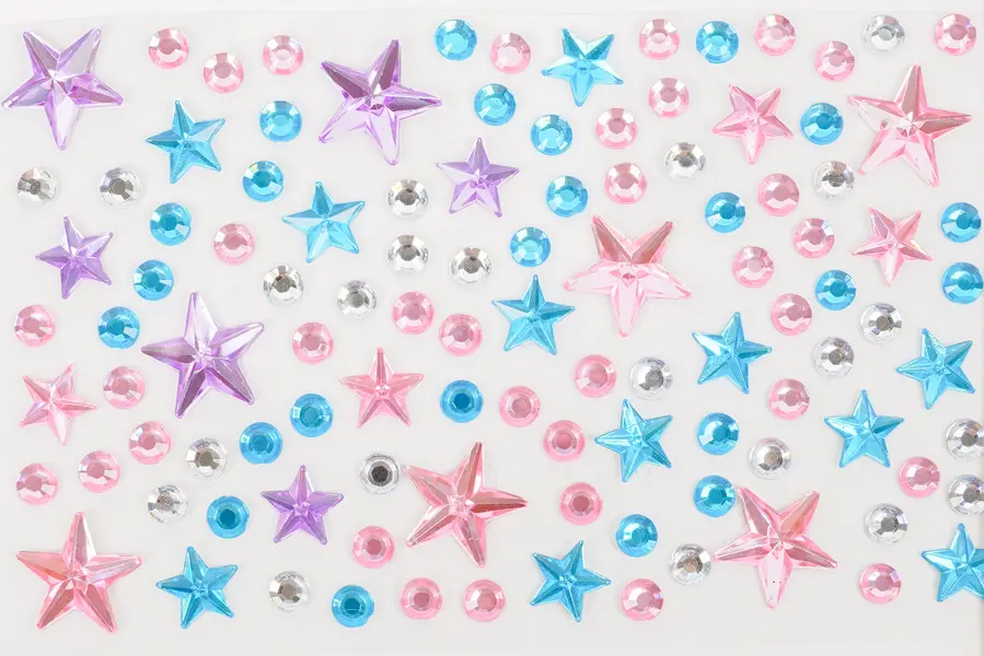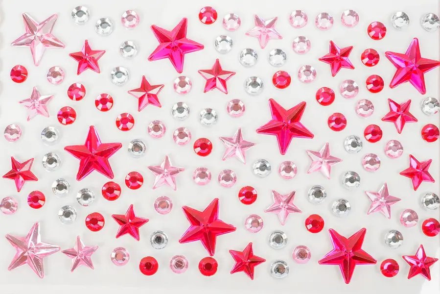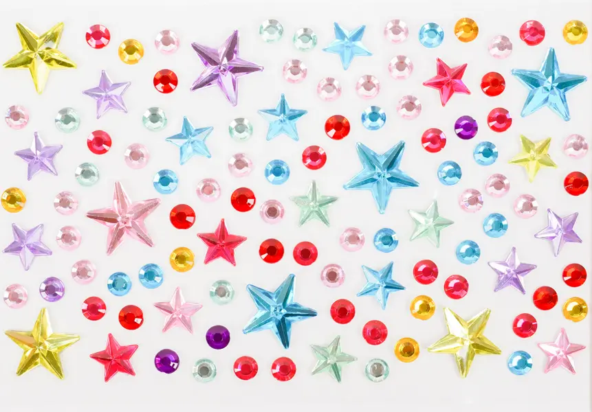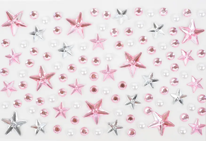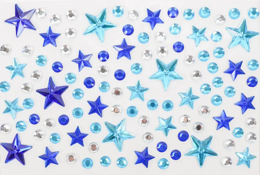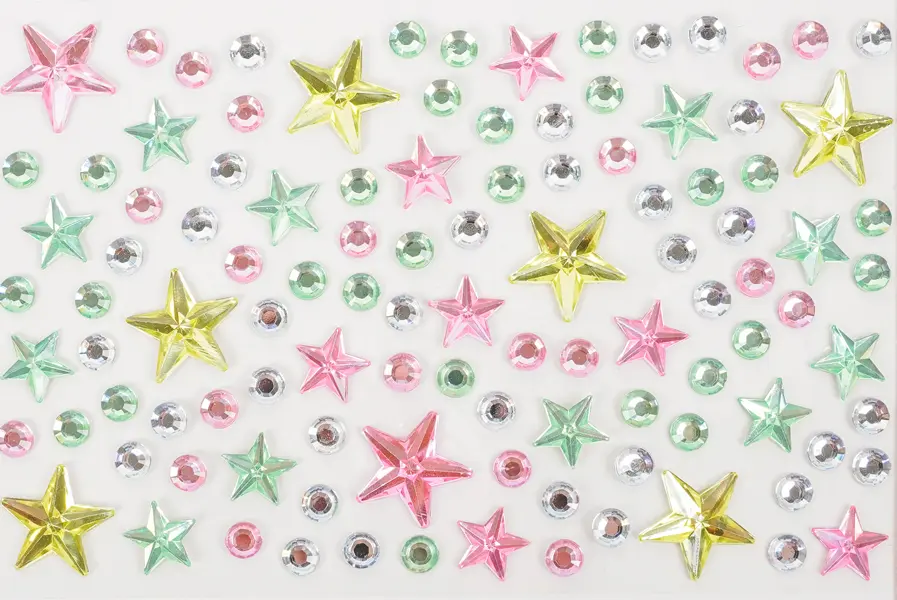 Toto balenie obsahuje 10 hárkov samolepiacich kamienkov s motívom hviezdičiek. Kamienky sú v mixe farieb, veľkostí a tvarov, čo umožňuje široké kreatívne využitie. Kamienky na hárkoch s veľkosťou 9,5 x 15 cm sú ideálne na zdobenie prianí, denníkov, scrapbookingu, fotoalbumov, telefónov, tabletov, ale aj nechtov, vlasov a mnohých ďalších projektov.