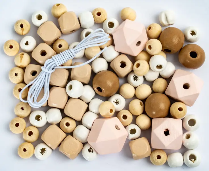 drevené rôzne farebné korálky, rozmer korálkov 10 - 18 mm, v balení 80 ks + biela elastická šnúrka 1 m