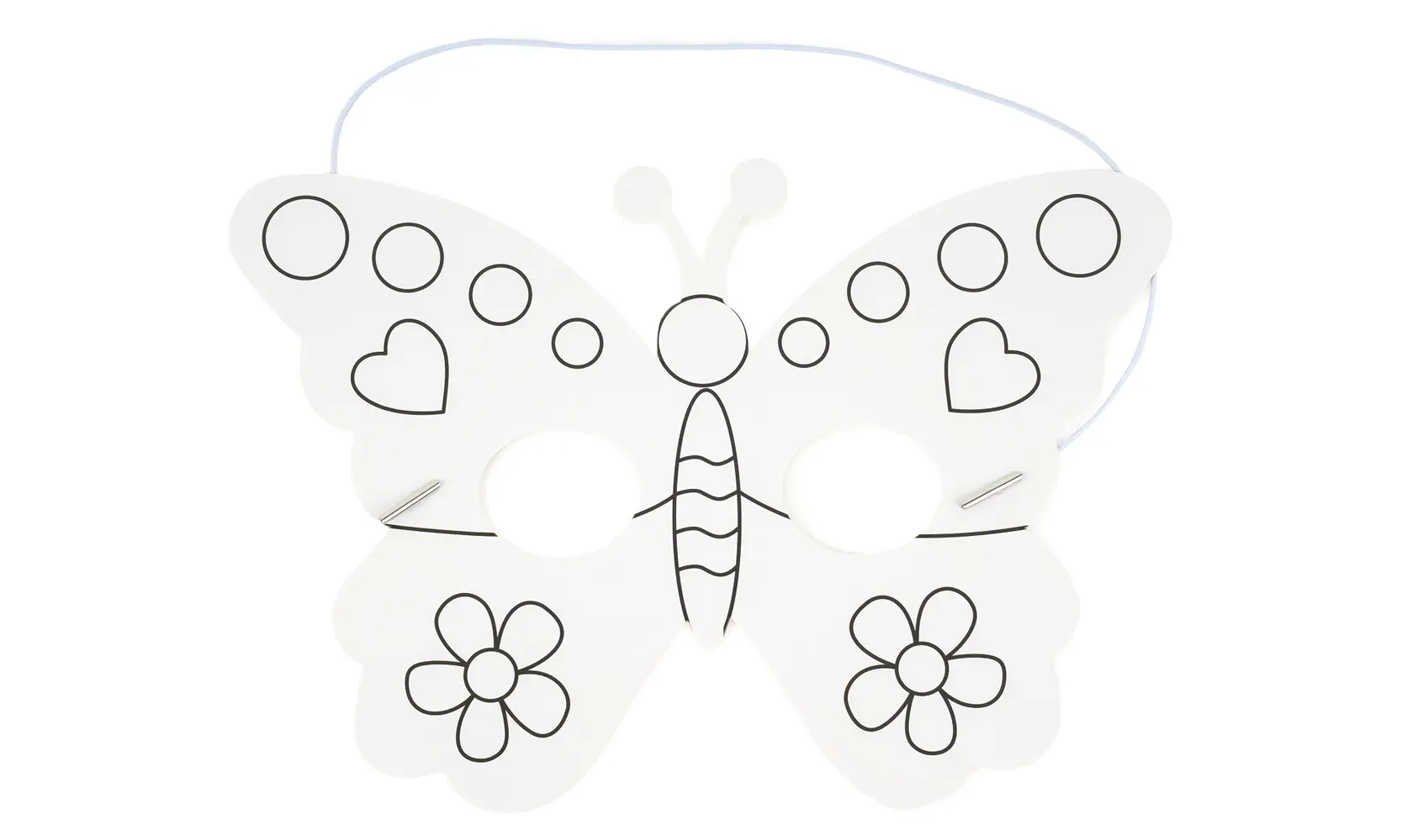 Papierová škraboška na tvár s motívom motýľa je ideálna pre deti, ktoré si ju môžu samy vymaľovať podľa svojej fantázie. Škraboška je biela, má natlačené kontúry motýlieho tela s veľkými krídlami s vyznačenými tvarmi, ako sú kruhy, srdiečka a kvety, a je opatrená gumičkou pre jednoduché nasadenie. Jej rozmery sú približne 21,5 x 14,5 cm. Ide o skvelú kreatívnu pomôcku na detské párty, karnevaly alebo len tak pre zábavu.