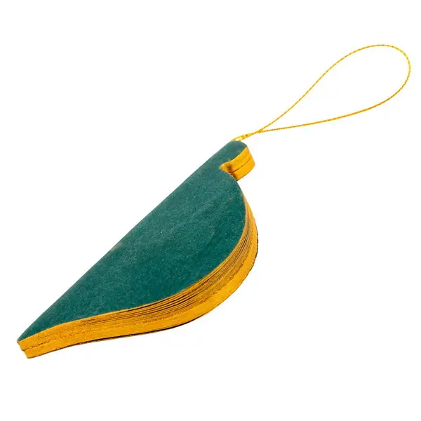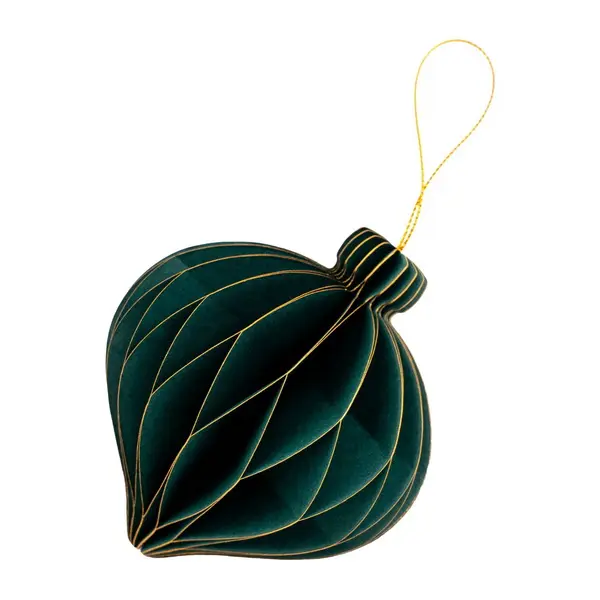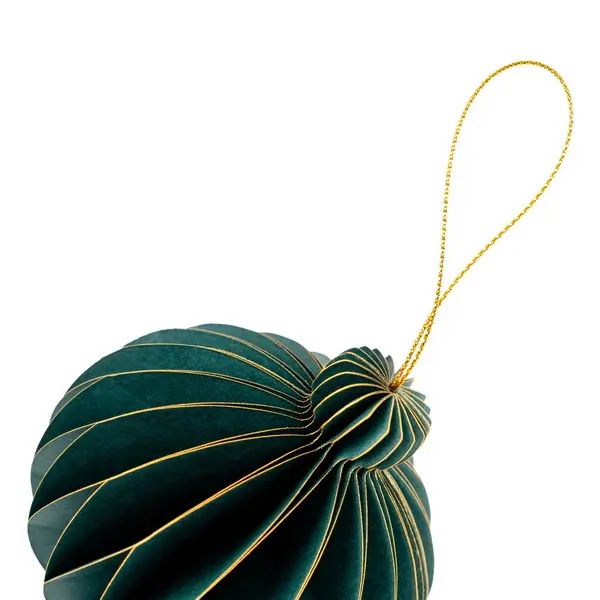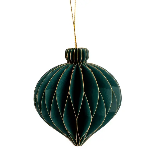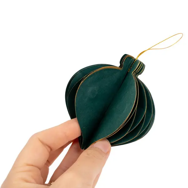 Ide o papierovú dekoračnú ozdobu v tvare podlhovastej vianočnej gule. Ozdoba má skladanú (harmonikovú) konštrukciu, ktorá po rozložení vytvorí trojrozmerný tvar. Po zložení drží ozdoba pohromade pomocou magnetu. Je vyvedená v elegantnej zelenej farbe so zlatými okrajmi a je ideálna na zavesenie. Veľkosť ozdoby je cca 9 cm.