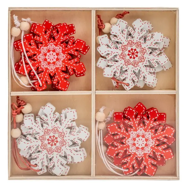 Ide o sadu 12 ks drevených dekoračných ozdôb v krabičke, navrhnutú na okamžité zavesenie i na vlastné dotvorenie. Dekorácie majú tvar prepracovaných vianočných vločiek (hviezd) v tradičných červeno-bielych farbách s rustikálnymi detailmi a sú ozdobené drobnými drevenými korálkami a špagátom na zavesenie. Každá dekorácia má veľkosť cca 5,5 cm. Ozdoby sú uložené v drevenej krabičke rozdelenej na štyri sekcie, krabička má rozmery 13,8 x 13,8 cm. Sada je ideálna na ozdobenie vianočného stromčeka, adventných vencov alebo ako originálny darček.