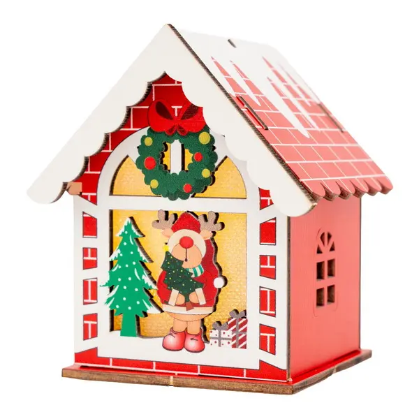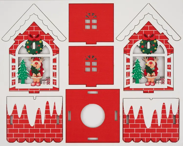 drevená stavebnice na stavbu domčeka, rozmery zmontovaného domčeku 9 x 7,5 cm, ľahko zostaviteľný, obsahuje svetielko a 3 batérie LR1130