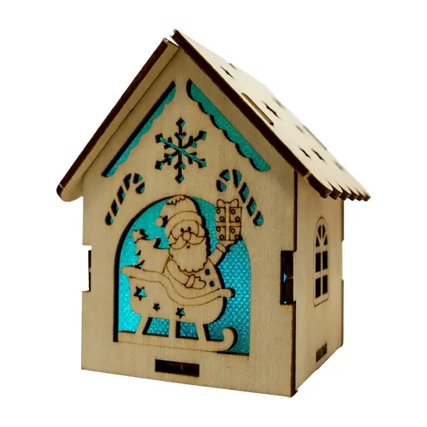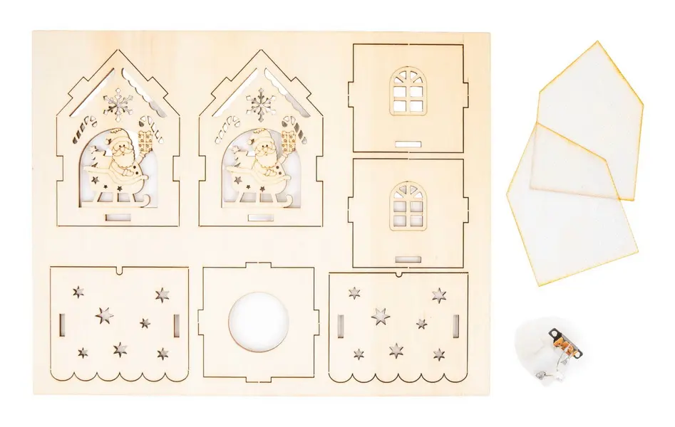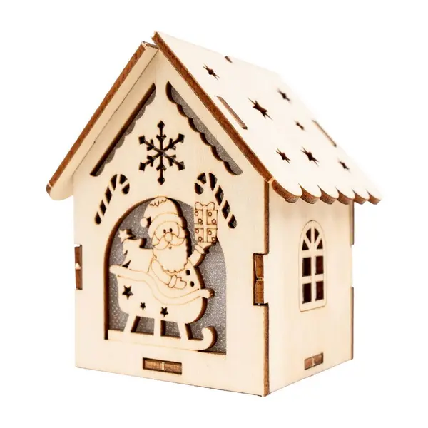 Ide o drevenú stavebnicu v tvare vianočného domčeka, ktorá je navrhnutá na jednoduché zostavenie. Domček je ideálny ako vianočná dekorácia na stôl, parapet alebo poličku. Je vyvedený v motíve/dekore dreva (prírodné nefarbené drevo) s vyrezávanými detailmi. Vo vnútri domčeka je umiestnený sviatočný motív Santa Clausa na saniach s darčekom a hviezdou, doplnený snehovou vločkou. Súčasťou balenia je aj integrovaná lampička (LED osvetlenie) a 3 batérie LR1130, ktoré po rozsvietení vytvárajú útulnú atmosféru s hviezdnymi odleskami na streche. Veľkosť zostaveného domčeka je cca 9 x 7,5 cm.