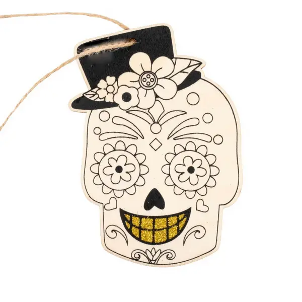 Ide o originálnu drevenú závesnú ozdobu, ktorá je určená na vlastné maľovanie (vymalovanie) a kreatívne dotvorenie. Ozdoba má tvar štýlovej mexickej lebky (Sugar Skull) s klobúkom, kvetmi a úsmevom, pričom zuby sú zvýraznené zlatým glitrovým lakom. Je vyrobená z prírodného dreva a je ideálna na dekoráciu do interiéru, ako darčeková visačka alebo ako zábavný projekt pre deti i dospelých. V hornej časti je opatrená jutovým povrázkom na jednoduché zavesenie. Veľkosť ozdoby je 13 cm.