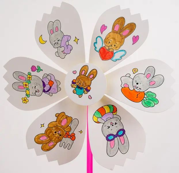papierový veterník so šablónou na maľovanie, stredové koliesko, tyčka, celková dĺžka zloženého veterníka 38,5 cm